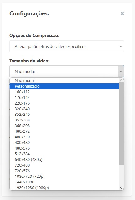 Depois disso escolha "Personalizado" em "Tamanho do Vídeo". Conforme mostra a imagem abaixo.