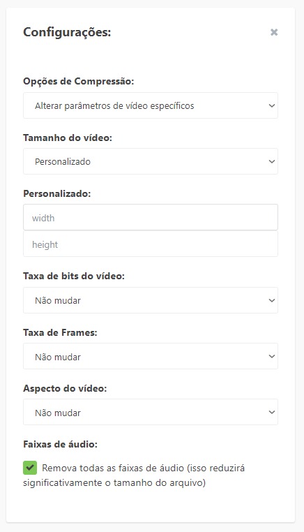 Nos campos que vão aparecer coloque as novas informações de proporção que você conseguiu na nossa ferramenta aqui nesta página no quadro de resultados. Coloque a "Nova Largura" no campo "width" e coloque a "Nova Altura" no campo "height". Dica: Se não for necessário ter áudio no seu vídeo, deixe a marcada a opção "Remova todas as faixas de audio", isso vai deixar o seu vídeo muito mais leve. Entenda melhor na imagem abaixo.