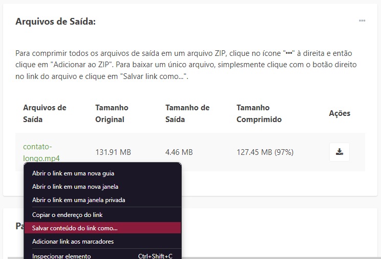 Depois de comprimido uma maneira mais fácil de fazer o download do vídeo é clicando no link do vídeo comprimido com o botão direito do mouse e escolher a opção "Salvar como..." ou "Salvar conteúdo do link como...", assim como mostra a imagem abaixo. Veja que escolhendo bem as configurações é possível reduzir muito o tamanho dos seus vídeos.